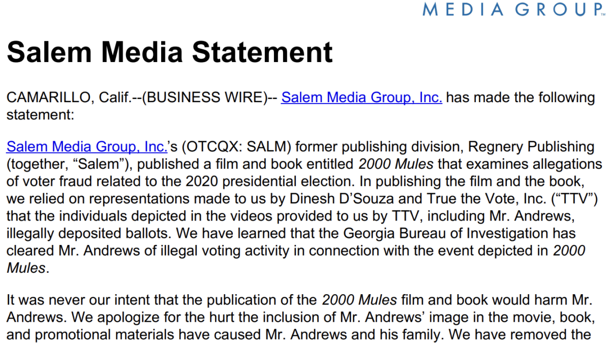 On May 31, 2024, Salem Media Group issued a release (image below), stating in part “It was never our intent that the publication of the 2000 Mules film and book would harm Mr. Andrews. We apologize for the hurt the inclusion of Mr. Andrews’ image in the movie, book, and promotional materials have caused Mr. Andrews and his family. We have removed the film from Salem’s platforms, and there will be no future distribution of the film or the book by Salem.