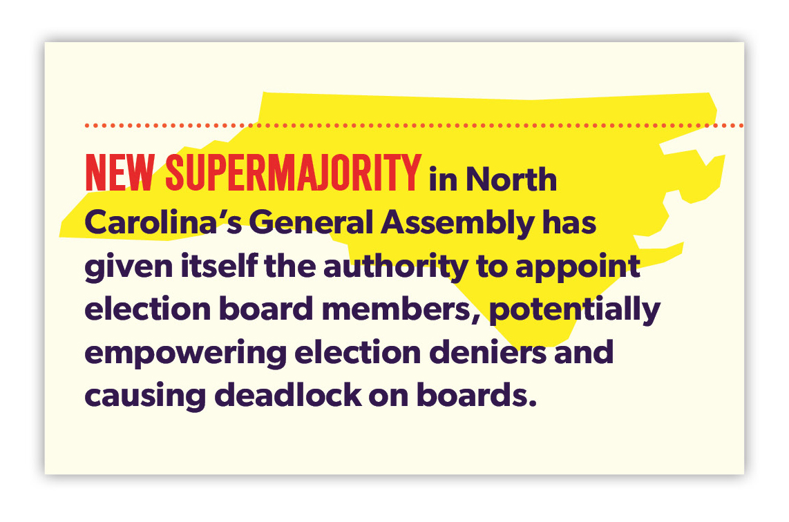 In April 2023, a recently elected North Carolina representative switched her party affiliation from Democrat to Republican3Nick Corasaniti and Neil Vigdor, “Democrat’s U-Turn to Join the G.O.P. Upends North Carolina Politics,” New York Times, Apr. 5, 2023, https://www.nytimes.com/2023/04/05/us/politics/tricia-cotham-north-carolina.html., which gave election deniers in the statehouse more power in both chambers of the General Assembly4Kyle Ingram, “After meeting with ex-Trump lawyer, GOP pitches new NC voting rules vetoed by Cooper,” The News and Observers, June 21, 2023, https://www.newsobserver.com/news/politics-government/election/article275979931.html.. This new supermajority went on to pass legislation that dramatically shifted election administration in the state, creating new sources of confusion and potential chaos during elections.