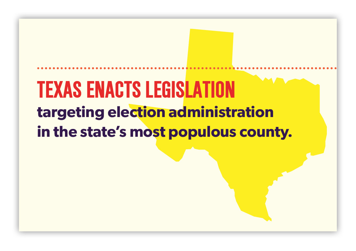 This summer, Texas enacted two alarming laws specifically targeting Harris County (based on population thresholds set in the bills). Harris County is home to Houston, has over 2,500,000 registered voters, and a large share of the state’s registered Democratic voters12“Harris County Voter Registration Figures,” Texas Secretary of State, accessed Nov. 20, 2023, https://www.sos.state.tx.us/elections/historical/harris.shtml.. The first of these bills, S.B. 1750, abolished the Harris County election administrator’s office, transferring its duties to the county tax assessor and county clerk, and away from the election administrator and staff specifically trained and prepared to administer elections13Harris County filed a lawsuit alleging that this precise targeting was illegal. The Texas State Supreme Court allowed to remain in effect through the 2023 election cycle and slated the case for further consideration in late November. See Tom Abrahams, “Harris Co. election administrator is jobless after TX Supreme Court rules Senate Bill 1750 into law,” ABC Eyewitness News, Aug. 22, 2023, https://abc13.com/senate-bill-1750-harris-county-politics-houston-elections-area-politicians/13685768/.. Harris County filed a lawsuit challenging the constitutionality of S.B. 175014Natalia Contreras, “Harris County’s election chief remains in legal limbo after judge rules that lawmakers can’t dissolve the position,” The Texas Tribune, Aug. 15, 2023, https://www.texastribune.org/2023/08/15/harris-county-elections-changes-ruling/. Harris County ultimately dropped the lawsuit, with the county attorney calling the case “moot” because the county was required to comply with the law as of September 1, 2023. Jen Rice, “Harris County drops lawsuit challenging new state law that eliminated its election office,” Houston Chronicle, Nov. 24, 2023, https://www.houstonchronicle.com/politics/houston/article/harris-county-drops-lawsuit-18510850.php.. This law, which was opposed by election officials, threatens to harm elections in the state’s most populous county by opening gaps between the voter registration and elections processes that were closed when both functions were housed in one office and by confusing voters over which office to turn to when they have time sensitive, and sometimes complicated, election questions15Natalia Contreras, “Harris County must remove its elections chief under new legislation headed to Gov. Greg Abbott,” The Texas Tribune, May 23, 2023, https://www.texastribune.org/2023/05/23/texas-legislature-harris-county-elections/..