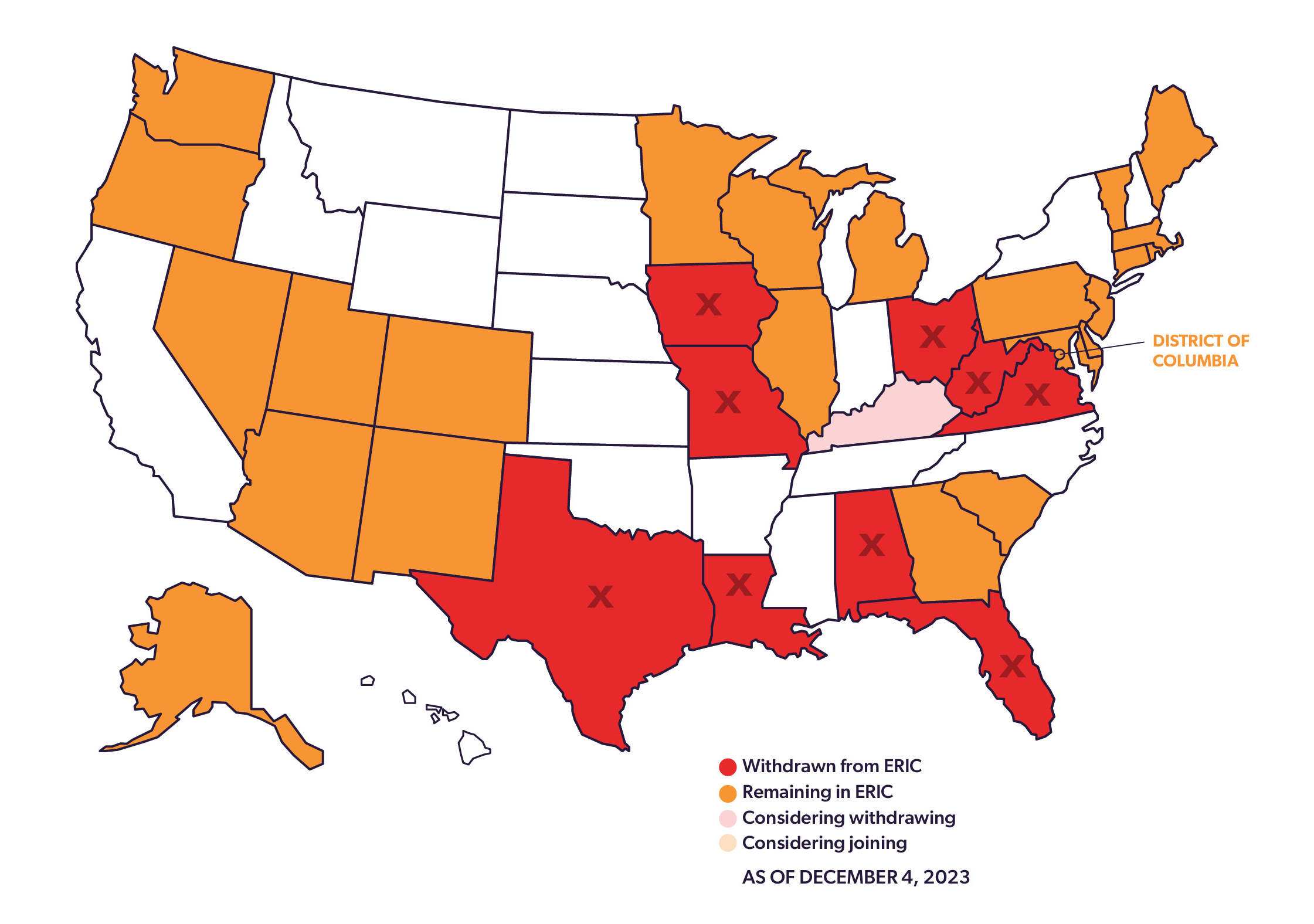 In our June 2023 Report, we discussed the disinformation campaign targeting ERIC, a membership organization that helps state election officials maintain accurate voter rolls. At the time of our June Report, despite widespread bipartisan concern about the implications of withdrawing, eight states had withdrawn their membership39A Democracy Crisis in the Making Report: 2024 Election Threats Emerging, supra n. 1, at 23., bringing the total number of state members to 25 as well as the District of Columbia40“About ERIC,” ERIC, accessed Nov. 17, 2023, https://ericstates.org/about/.. In addition, two states (Alaska and Texas) were considering withdrawing, while California was considering joining41A Democracy Crisis in the Making Report: 2024 Election Threats Emerging, supra n. 1, at 23.. Since June, the California legislation stalled42A.B. 1206, 2023 Leg., Reg. Sess. (Calif. 2023). and Alaska’s Division of Elections confirmed its continued membership43James Brooks, “Some GOP states depart, but Alaska will stay with voter fraud prevention network ERIC,” Alaska Public Media, June 8, 2023, https://alaskapublic.org/2023/06/08/some-gop-states-depart-but-alaska-will-stay-with-voter-fraud-prevention-network-eric/.. Texas, however, passed legislation requiring the state’s withdrawal from ERIC, further perpetuating the worrisome cycle that leaves both member and non-member states with fewer options for cross-checking state voter rolls44Natalia Contreras, “Texas begins withdrawal from multistate partnership to clean voter rolls,” The Texas Tribune, July 20, 2023, https://www.texastribune.org/2023/07/20/texas-republican-voter-roll-eric/..