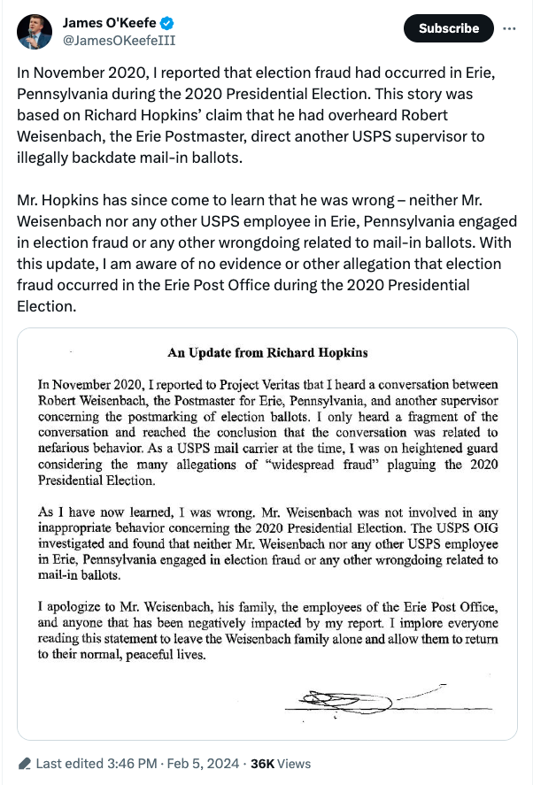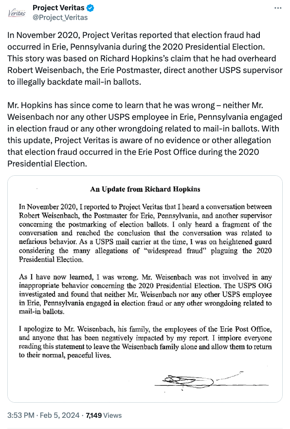 Judge says Erie postmaster can sue Project Veritas for libel over mail-in ballot claims Erie Times-News, July 19, 2022 Judge says Erie postmaster can sue Project Veritas for libel over mail-in ballot claims
