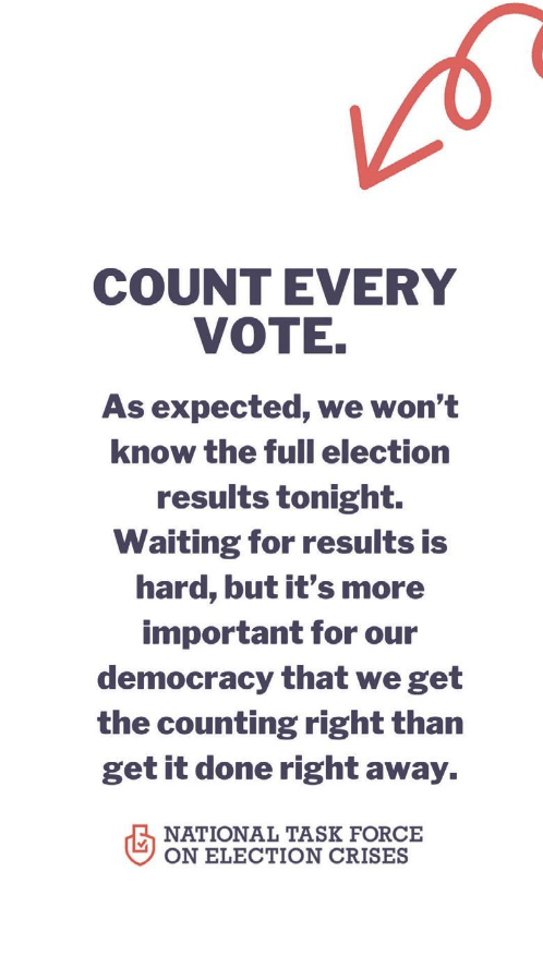 - Building a messaging army of hundreds of leaders nationally and in eight key states to speak as one unified public voice using Task Force-coordinated messaging before and during the crisis, which resulted in unified messaging across various public spheres to “Count Every Vote” while the presidential election was still being determined.