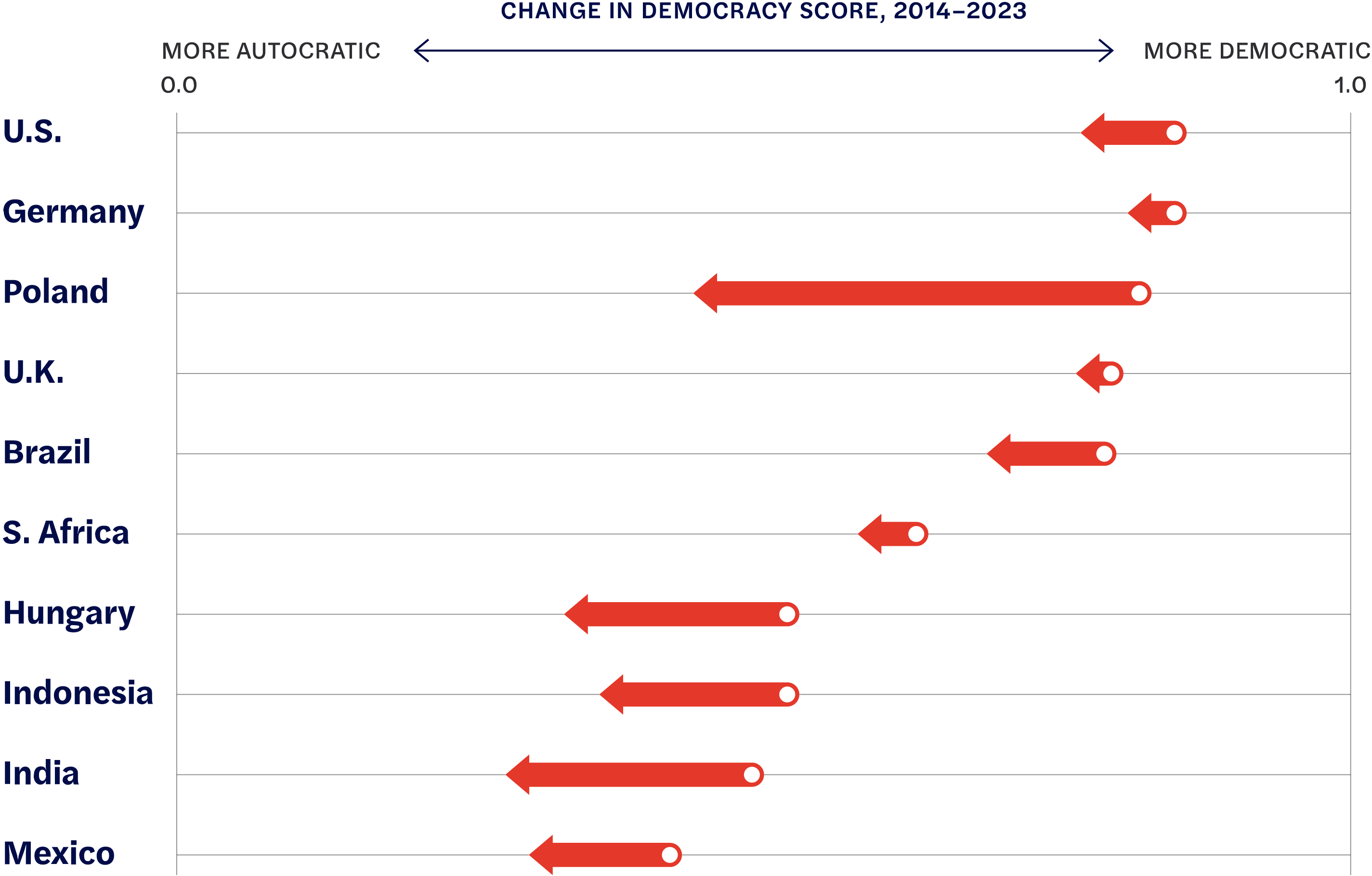 Global freedom is threatened not just by rising autocracies, but also by major democracies faltering from within. This graph shows the relative change in quality of democracy in key countries since 2014.