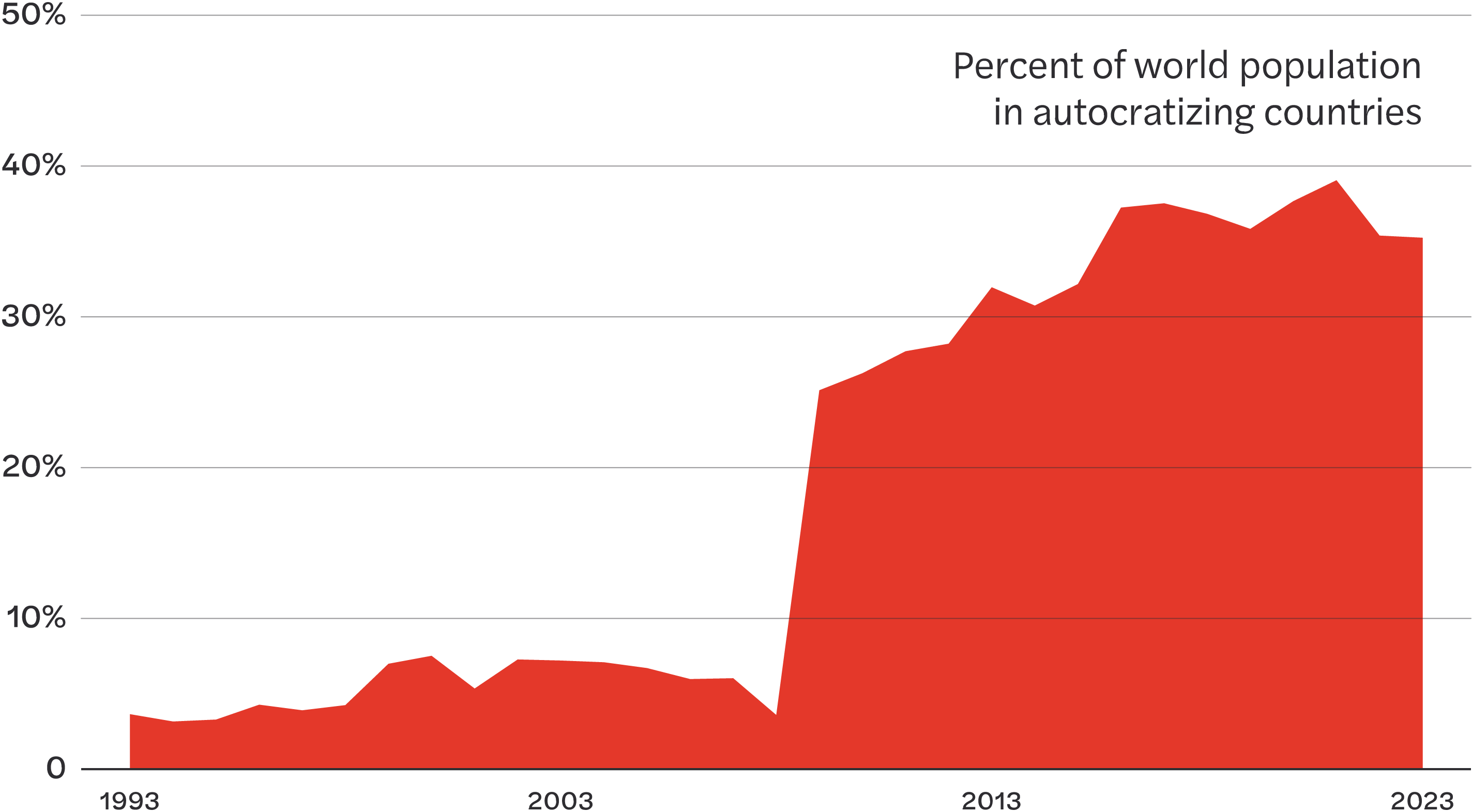 Past decades’ progress towards democracy has stalled and then reversed. Today, more than 2.8 billion people live in countries that are becoming increasingly autocratic.